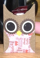 The body is created with a 2 3/4" x 8 1/2" cardstock, scored at 4 1/4". Using the 2 1/2" punch (120906), punch out half circles from each end to create the "ears" which are actually tufts. (I find it easier to fold the scored area of a project before running through an embossing folder.) Run through the Big Shot (113439) with the Fancy Fan Folder (127751) to create the look of feathers. Fold in half and tape together. The chest is 2 3/4" x 2" DSP and partial circles cut out for the wings. Attach to the very bottom of the body. The eyes are created with the 1 1/4" scallop, 1" and 3/4" circle punches (127811, 119868, and 119873). I also used the White Gel pen (105021) to mark small crescents on the eye. The nose/beak is actually the small heart punch (117193) place under the eyes and over the chest.
